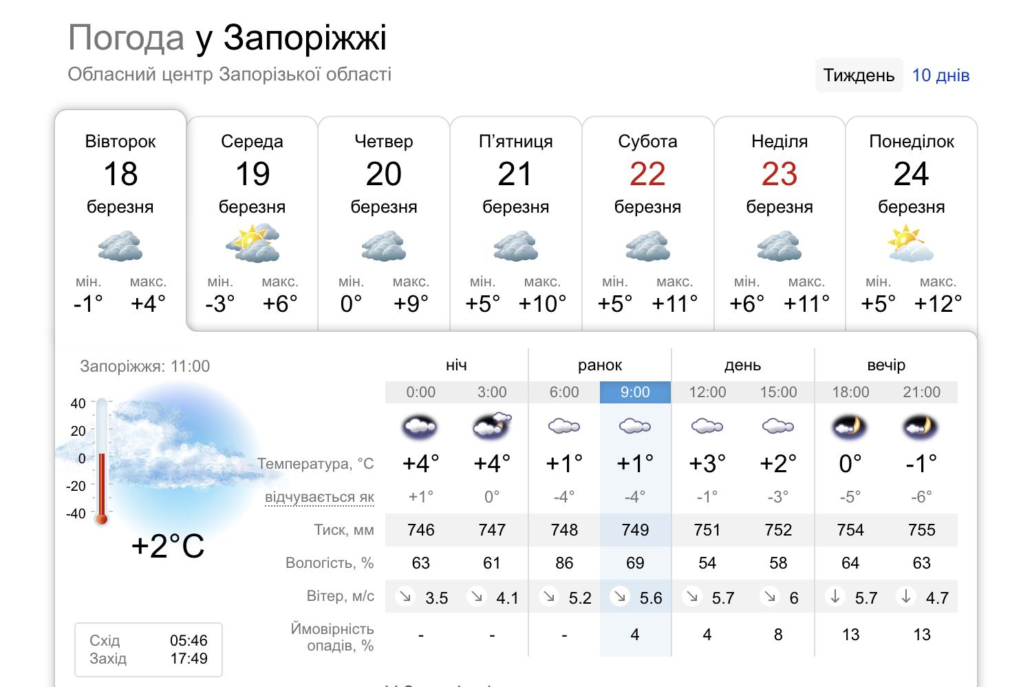После нескольких дней прохладной погоды в Запорожье синоптики прогнозируют потепление. Согласно актуальному прогнозу, уже с четверга, 20 марта, температура начнет постепенно расти. Если 18 и 19 марта еще будет наблюдаться минусовая температура ночью, то с 20 числа минимальная температура уже не будет опускаться ниже нуля, а днем столбик термометра поднимется до 9°C.