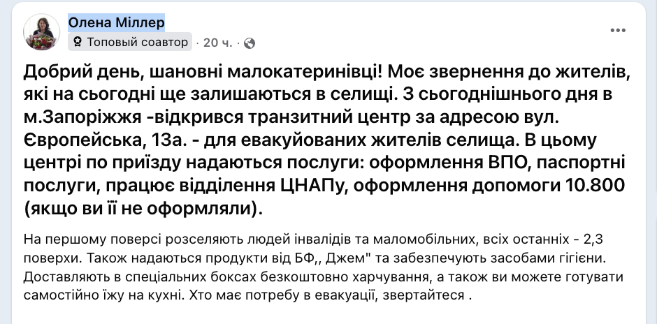 В Запорожье начал работу новый транзитный центр для жителей поселка Малокатериновка, которые были вынуждены покинуть дома из-за активных боевых действий. Об этом сообщила Елена Миллер.