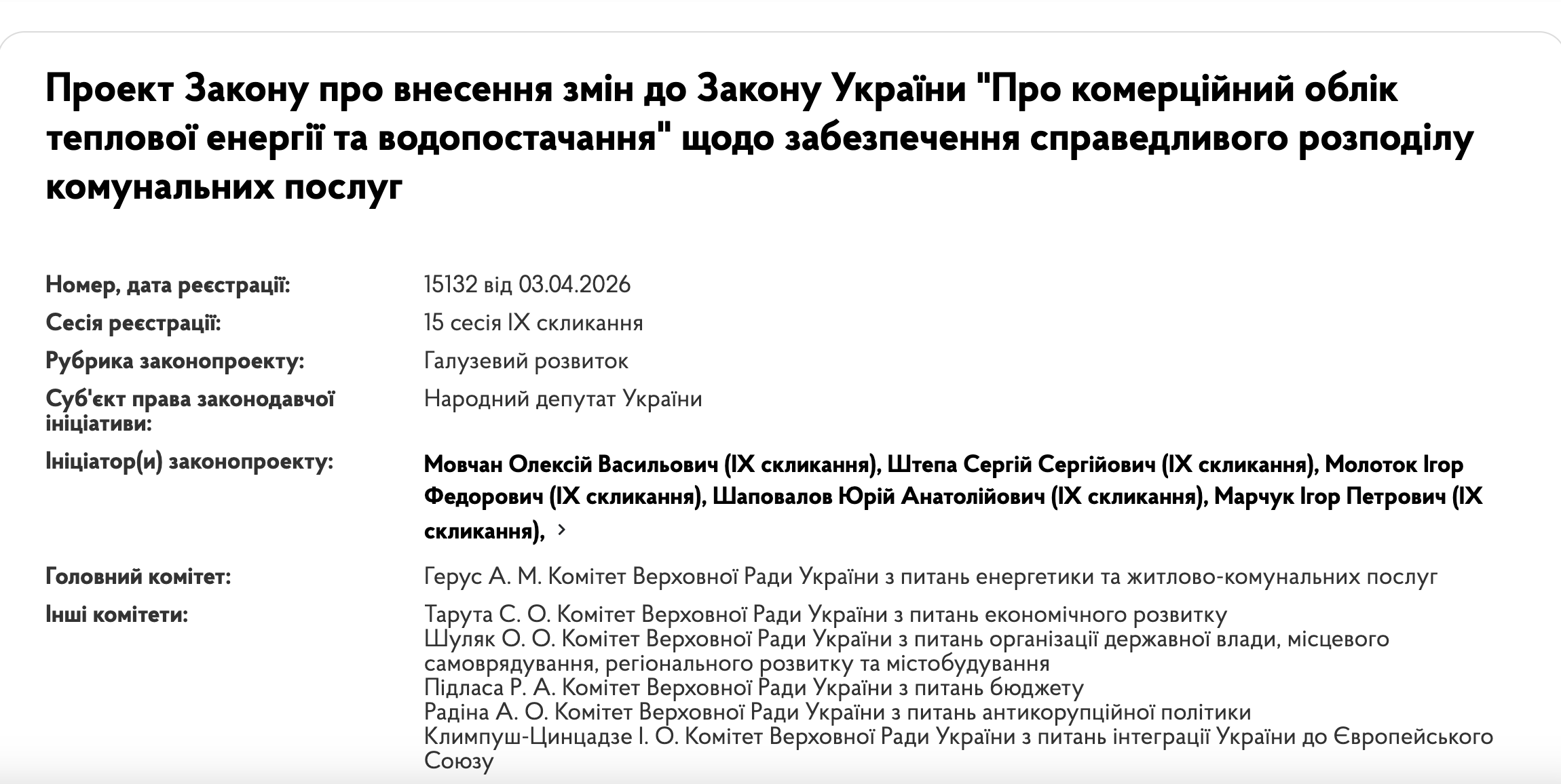В Верховной Раде зарегистрирован законопроект № 15132, который предлагает изменить правила оплаты за тепло и горячую воду. Важно: это пока не новый закон, а лишь законодательная инициатива. По состоянию на 13 апреля 2026 года документ все еще находится на стадии рассмотрения в комитете.