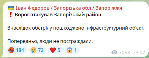 В Запорожском районе в результате вражеской атаки был поврежден инфраструктурный объект.