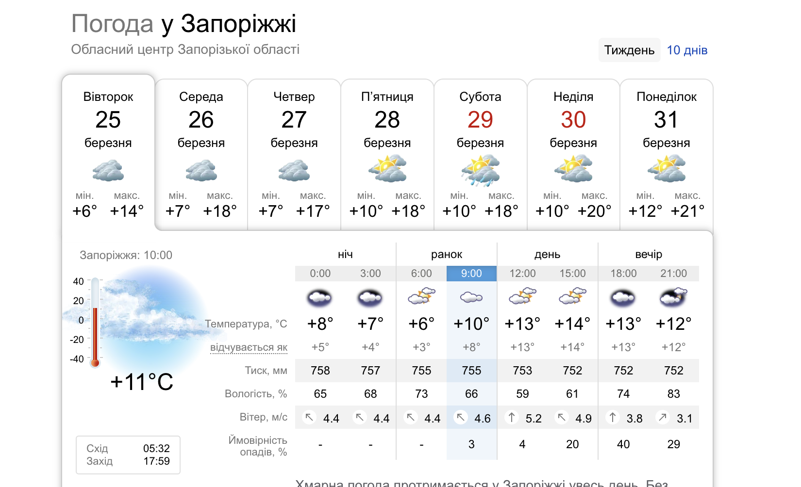 Вторник, 25 марта — еще относительно прохладный день, максимальная температура будет достигать 14°C, а ночная опустится до 6°C. Ожидается преимущественно облачная погода, без существенных осадков.