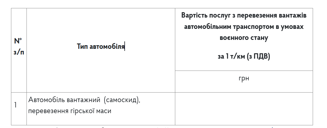 Стоимость услуг по перевозке грузов автомобильным транспортом (самосвал) в условиях военного положения за 1 т/км (с НДС).