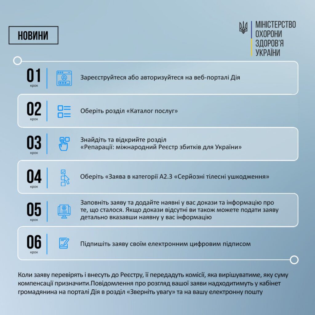 Украинцы, которые получили физические или психические травмы, пережили насилие, пытки, незаконное заключение или другой вред в результате вооруженной агрессии РФ, могут подать заявление о репарациях в международный Реестр убытков для Украины (RD4U). Об этом сообщает Министерство здравоохранения Украины.