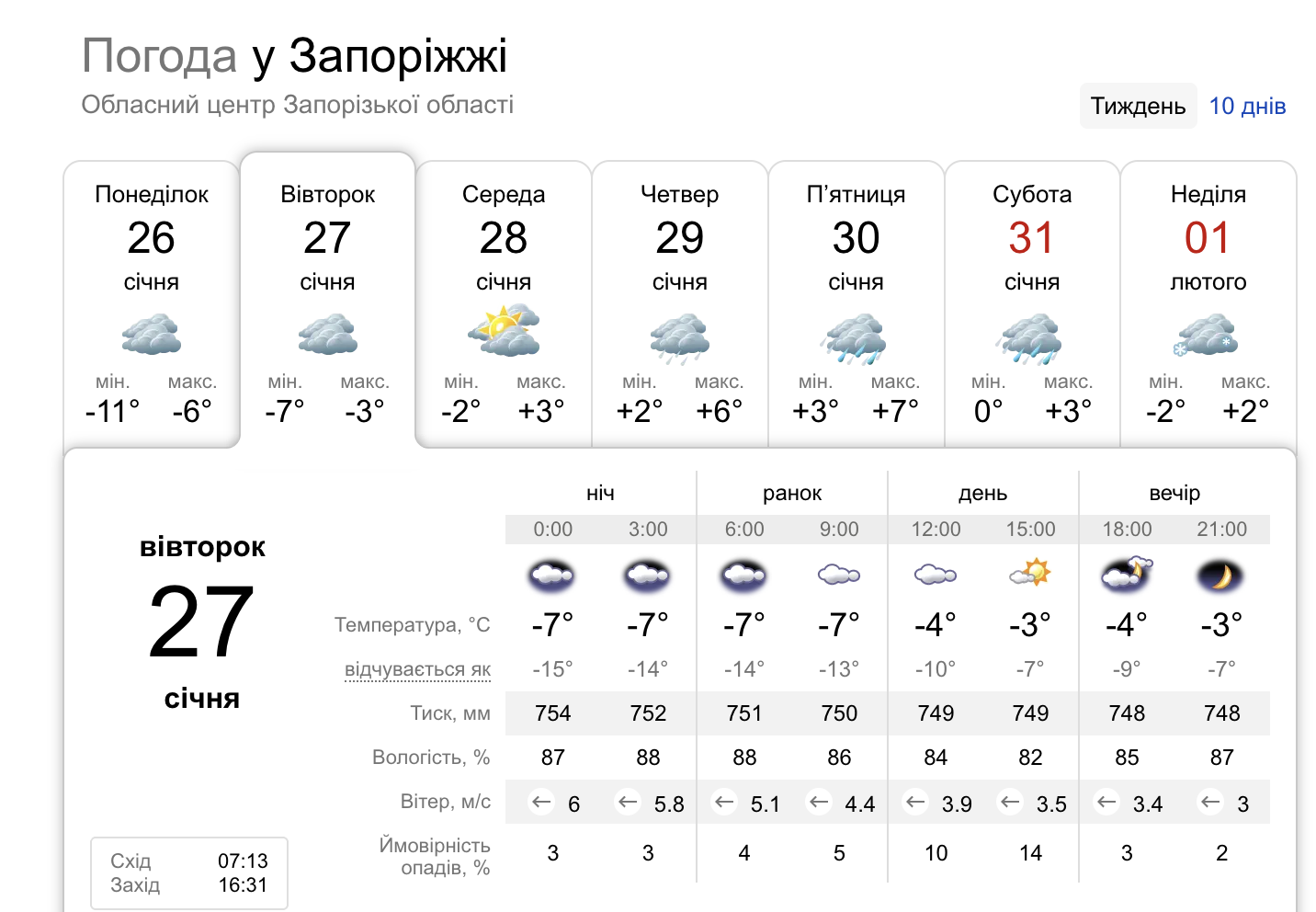 Во вторник, 27 января, в Запорожье сохранится холодная и преимущественно облачная погода без существенных осадков.
