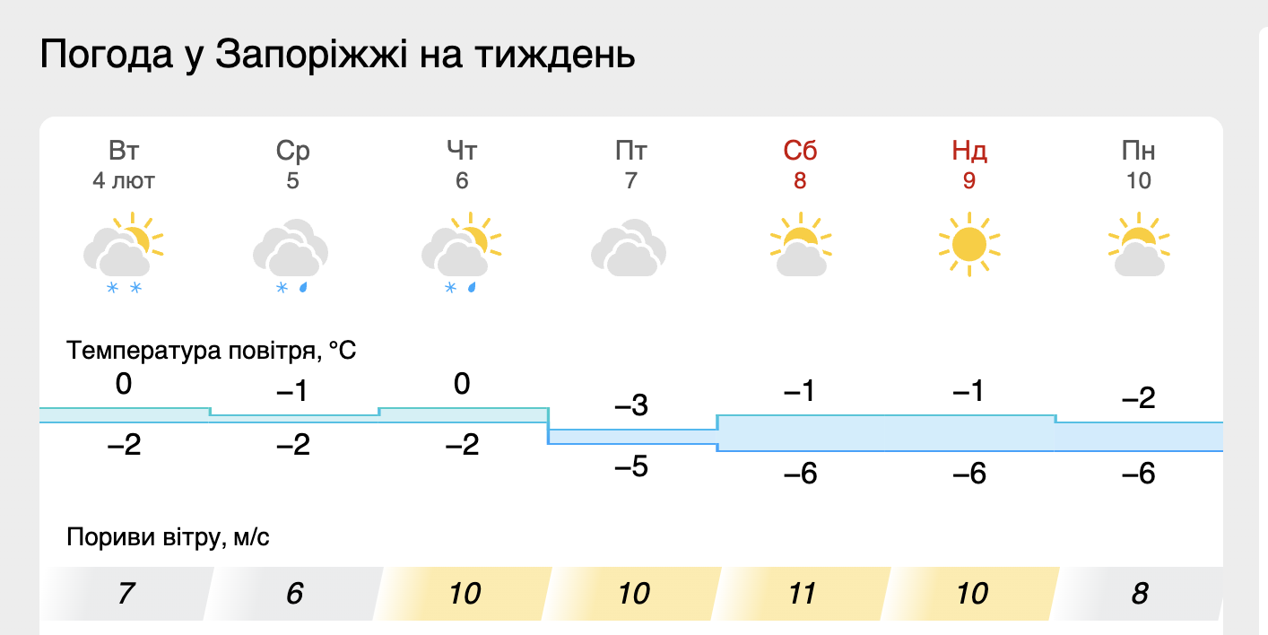 - Четверг, 6 февраля. Днем 0°C, ночью до -2°C. Ожидается снег с дождем. Порывы ветра до 10 м/с.