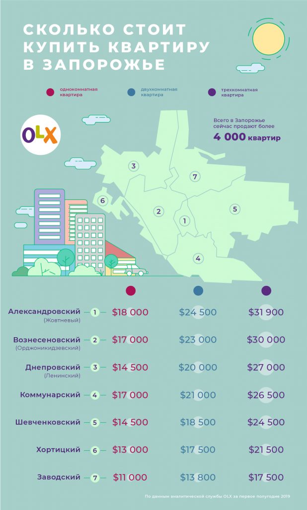 В целом рынок недвижимости в Запорожье развивается. Весной этого года на платформе OLX было размещено более 4 000 вариантов жилья. Тем не менее, это наименьший показатель по сравнению со Львовом (5 тыс), Днепром (9 тыс) или Харьковом, где количество предложений составляет в среднем 20 тыс.