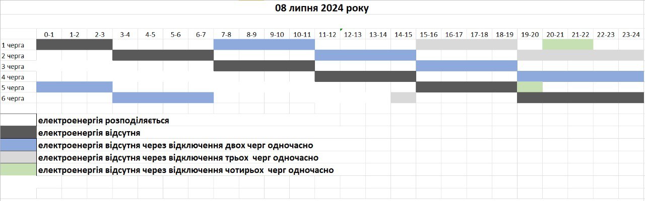 По указанию НЭК «Укрэнерго», 8 июля в Запорожской области в течение суток будут действовать графики почасовых отключений электроэнергии. В связи со сложной ситуацией в Объединённой энергетической системе в вечерние часы с 19:00 до 22:00 планируется отключение четырёх очередей одновременно, с 14:00 до 19:00 и с 22:00 до 24:00 – трёх очередей одновременно, в остальное время суток – с 00:00 до 14:00 – двух очередей одновременно.