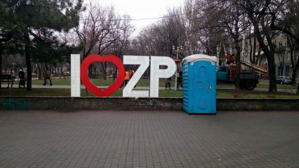 В Запорожье кабинку с биотуалетом установили прямо возле инсталляции “I love zp”, находящейся на пл. Маяковского. Об этом сообщают запорожские пользователи соцсетей.
