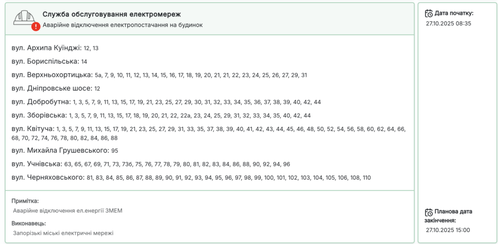 Аварійні відключення світла 27 жовтня Запоріжжя