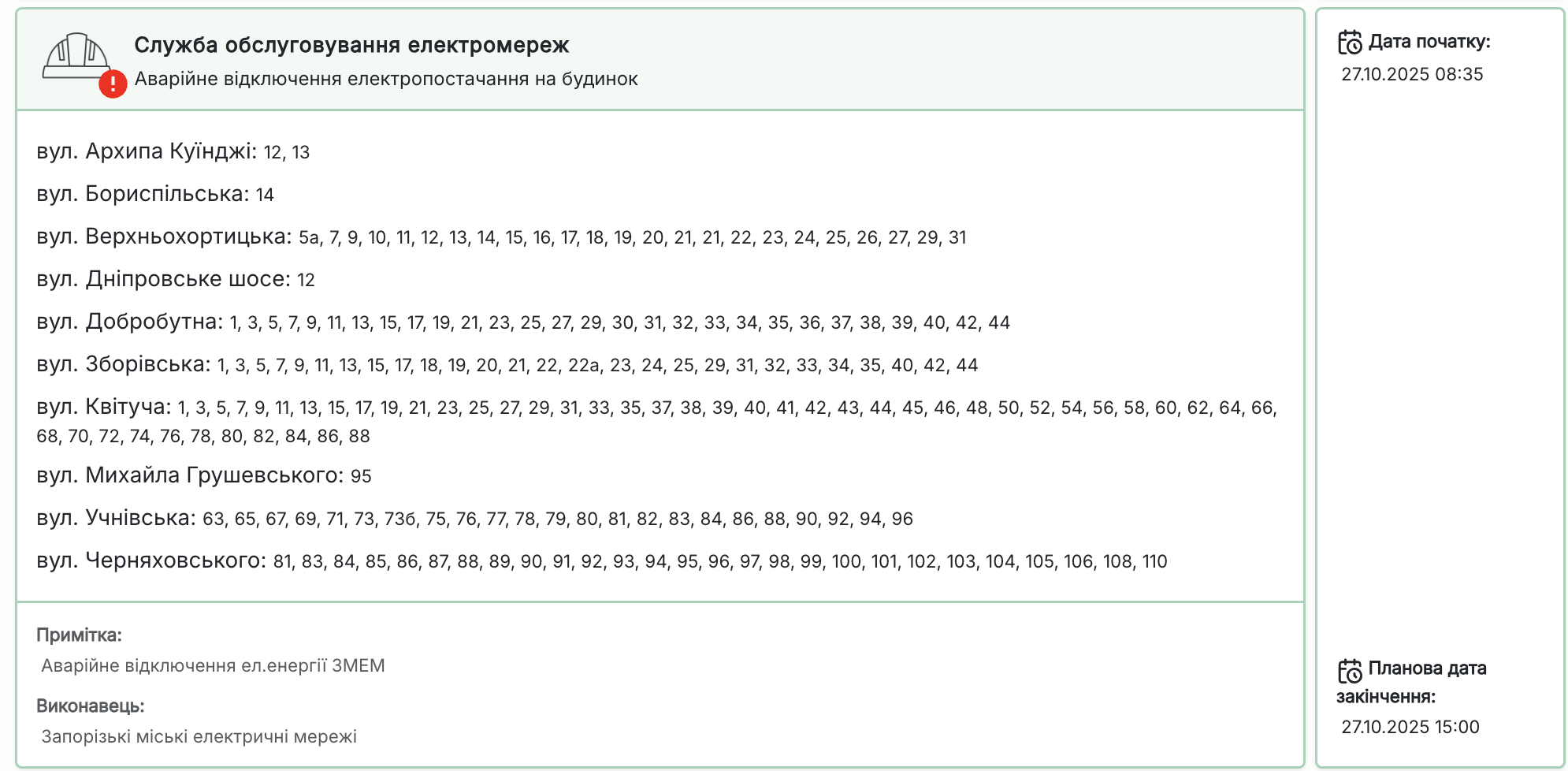 Сьогодні, 27 жовтня, у Запоріжжі відбувається аварійне відключення електроенергії, яке триває з 08:35 до 15:00. Роботи виконує Запорізька міська служба електричних мереж (ЗМЕМ).