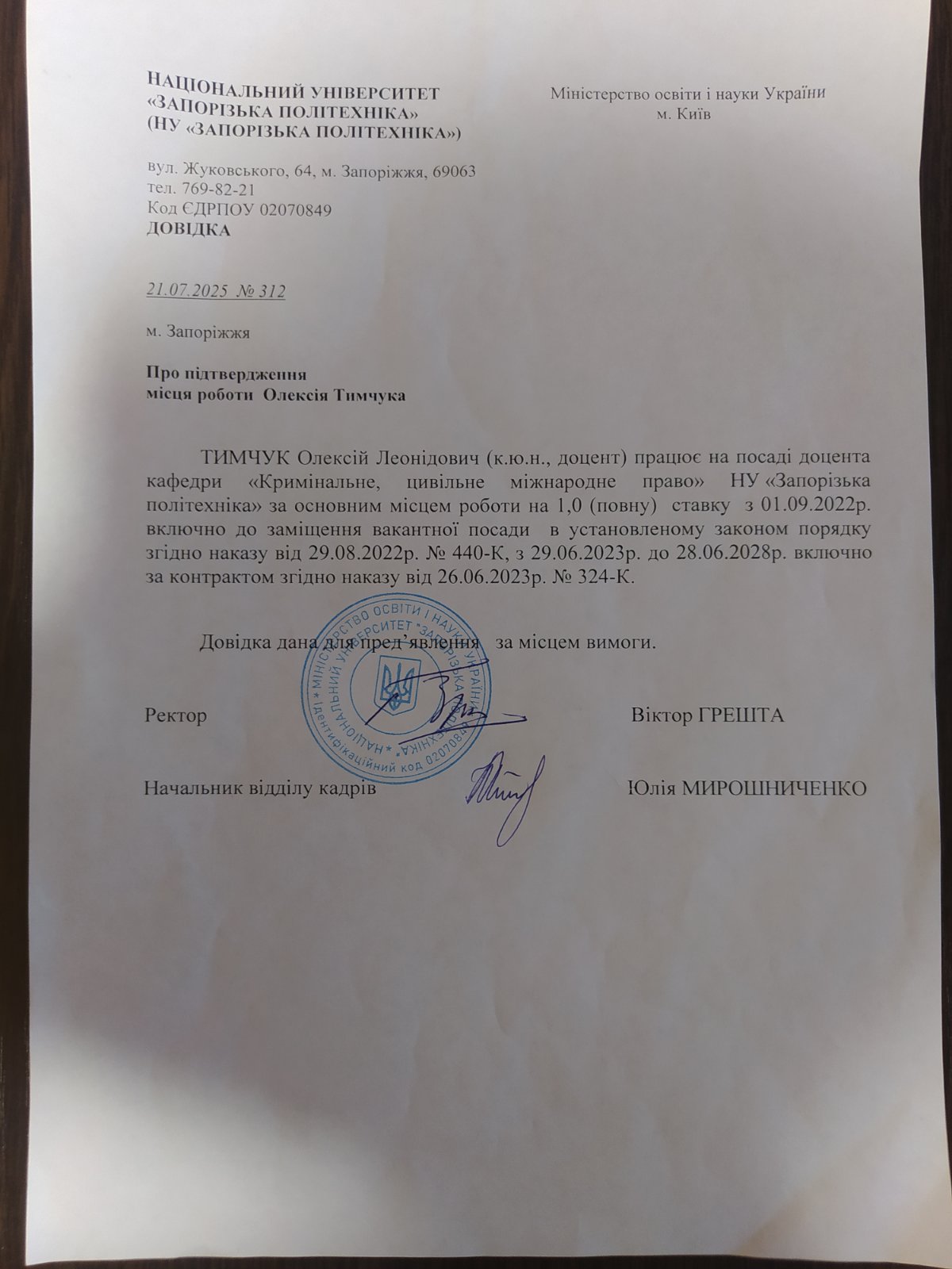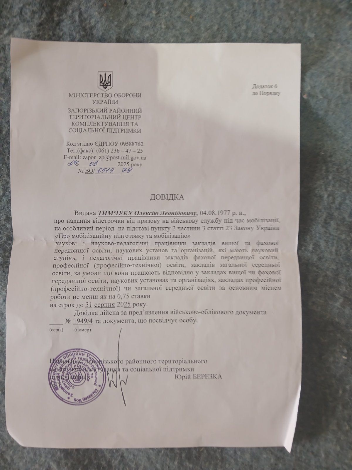 За інформацією університету, Олексій Тимчук надав довідку про відстрочку від мобілізації як науково-педагогічний працівник, видану Запорізьким районним ТЦК та СП. Строк дії документа — до 31 серпня 2025 року. Він також пред’явив дійсний військово-обліковий документ. Незважаючи на це, його затримали та силоміць доставили до ТЦК, де, як стверджує факультет, негайно оформили новий військово-обліковий документ із неправдивим записом про проходження ВЛК, яке, за словами самого викладача, не проводилося.