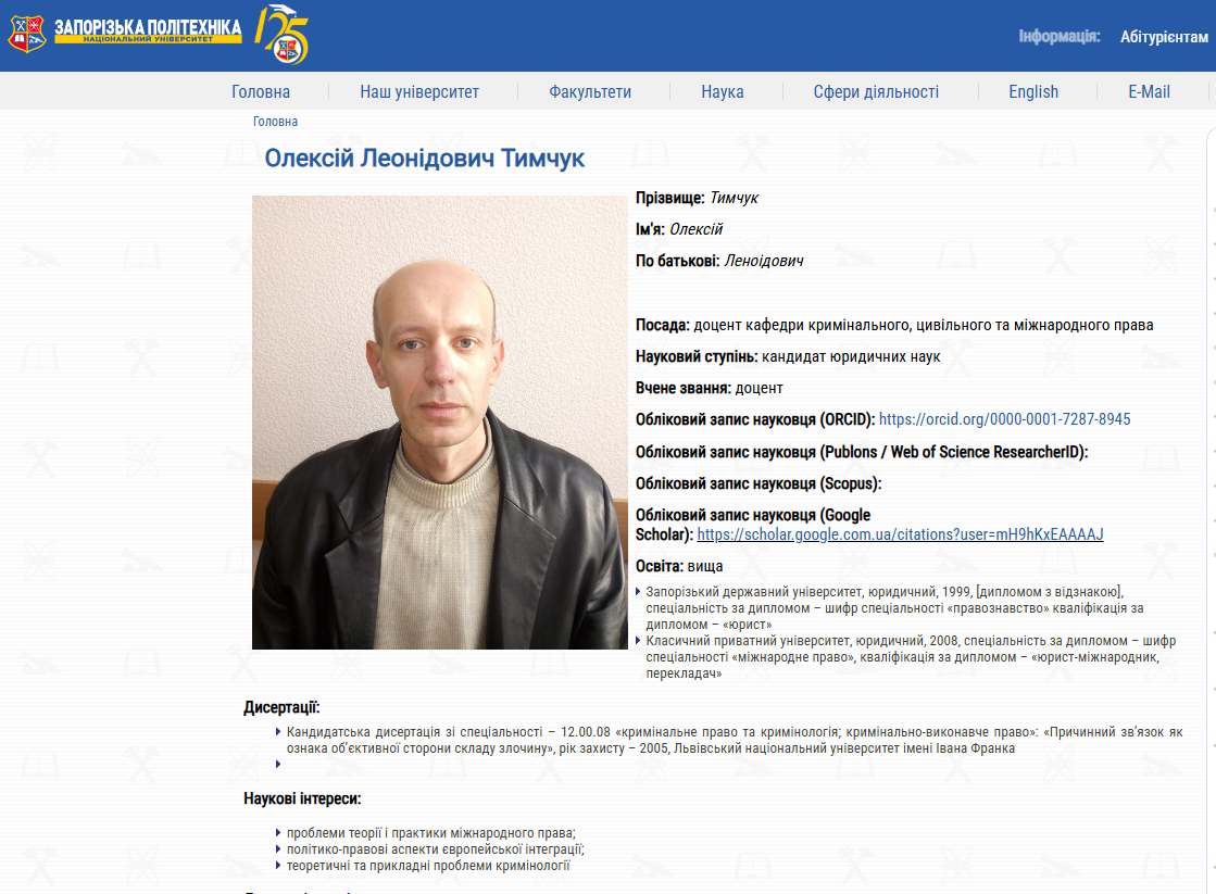 Колектив юридичного факультету Національного університету «Запорізька політехніка» звернувся з публічною заявою щодо зникнення свого колеги — кандидата юридичних наук, доцента кафедри кримінального, цивільного та міжнародного права Олексія Тимчука.