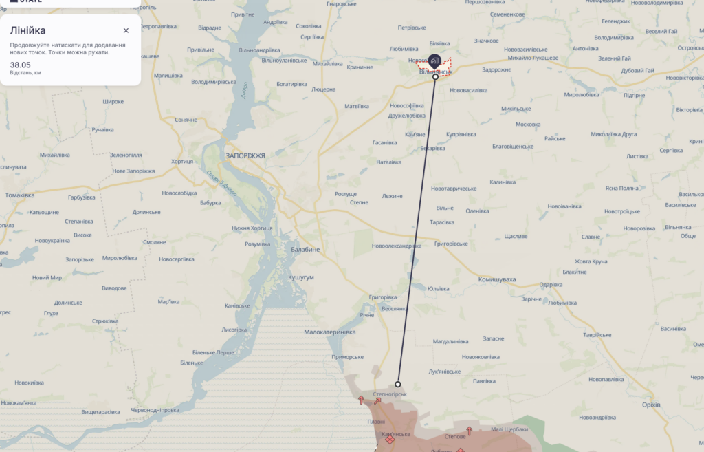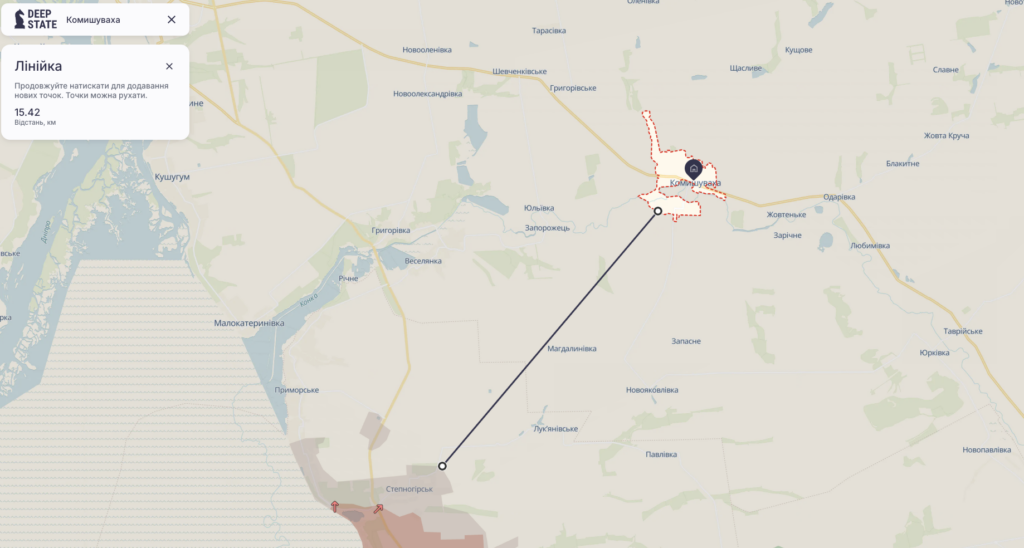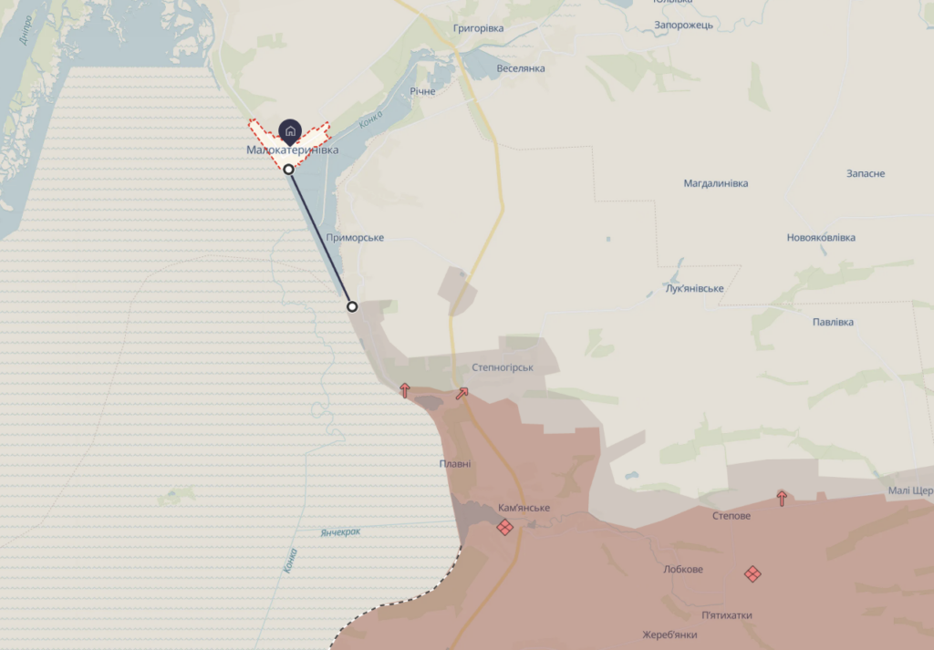 Малокатеринівка — один із найближчих до зони бойових дій населених пунктів на південь від Запоріжжя. На карті видно, що відстань до сірої зони, яка прилягає до Степногірська та передових позицій противника, становить приблизно 5,33 км. Це фактично межа, після якої будь-яка активність на місцевості може стати потенційно небезпечною, а цивільна інфраструктура працює із суттєвими обмеженнями.