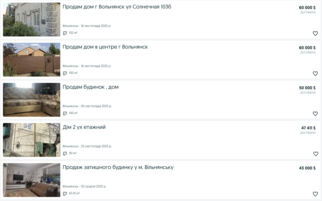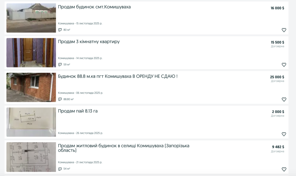 Попри ризики, у Комишувасі ринок не зупинився. Час від часу з’являються нові оголошення, а власники, які виїхали, намагаються продати майно за будь-якої можливості. За зібраними даними, можна окреслити чітку картину.