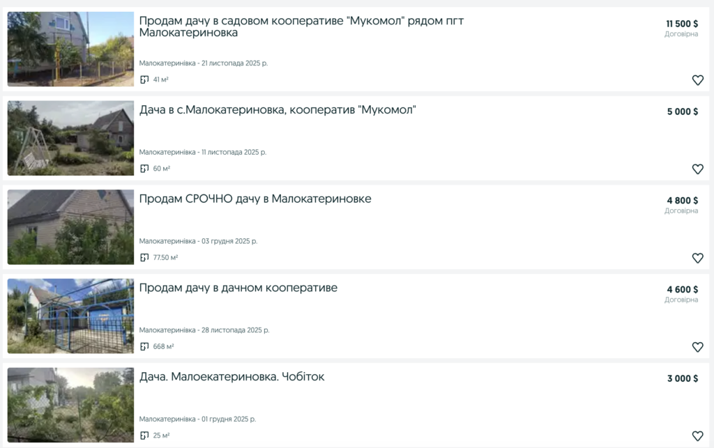Через близькість до сірої зони (≈5 км) у Малокатеринівці продаються майже виключно дачі. Ціни — одні з найнижчих у регіоні: