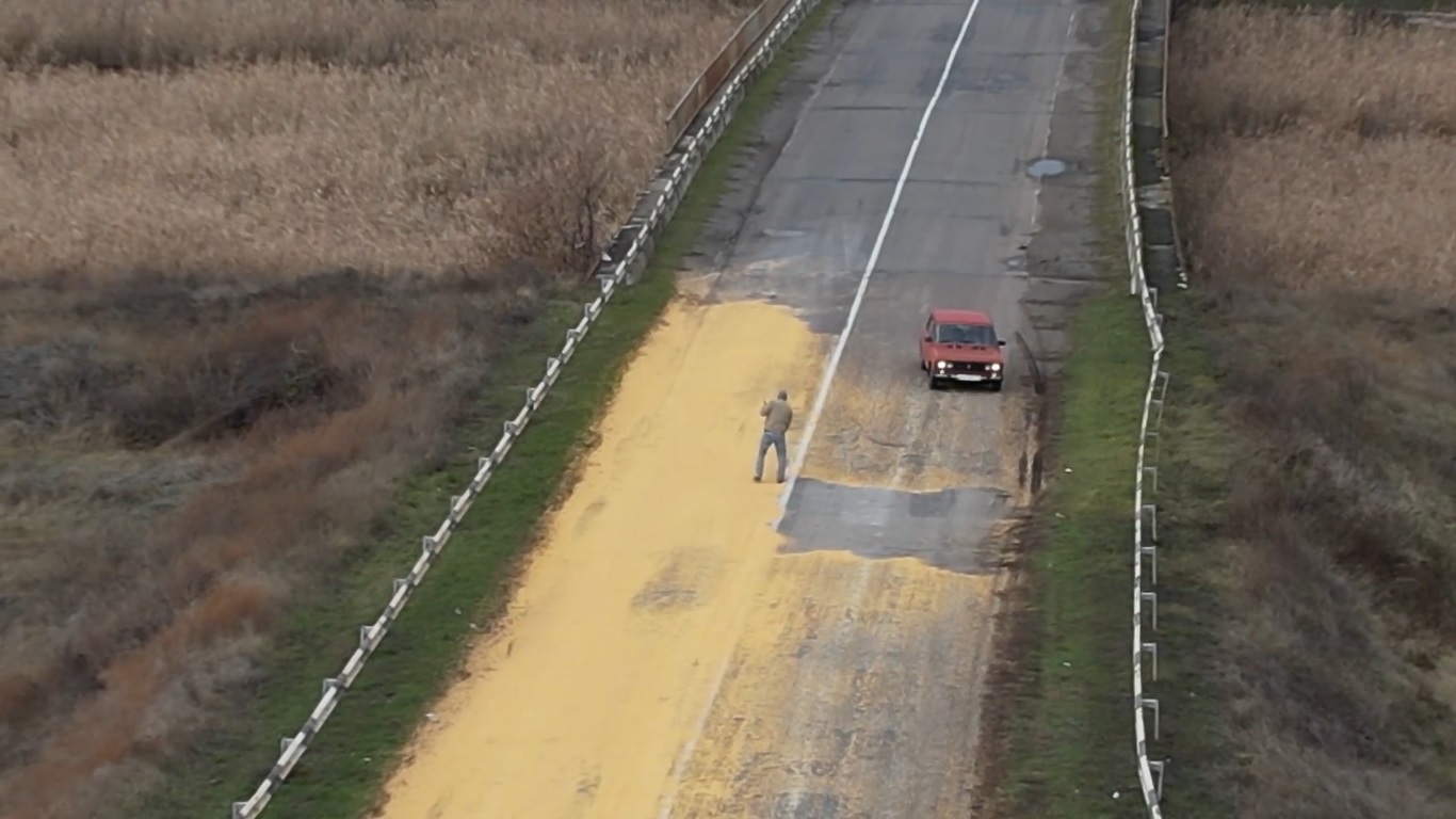 Известно, что из одного из зерновозов по какой-то причине стала на проезжую часть сыпаться куруруза. В итоге, вся дорога была услана зерновыми, а водители пытались собрать кукурузу лопатами.