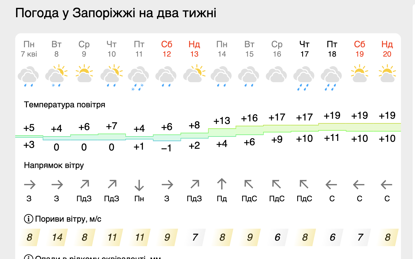 - Найвищі температури очікуються з 18 по 20 квітня: до +19°C.