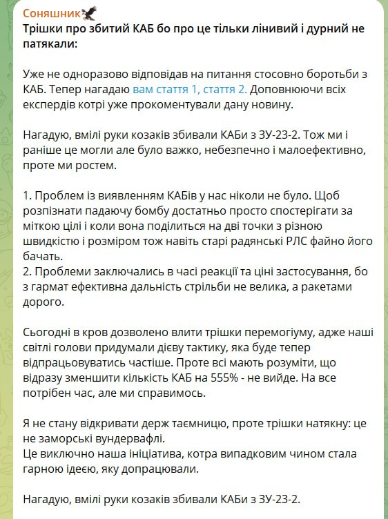 Уже не одноразово відповідав на питання стосовно боротьби з КАБ. Доповнюючи всіх експердів котрі уже прокоментували дану новину. Нагадую, вмілі руки козаків збивали КАБи з ЗУ-23-2. Тож ми і раніше це могли але було важко, небезпечно і малоефективно, проте ми ростем.