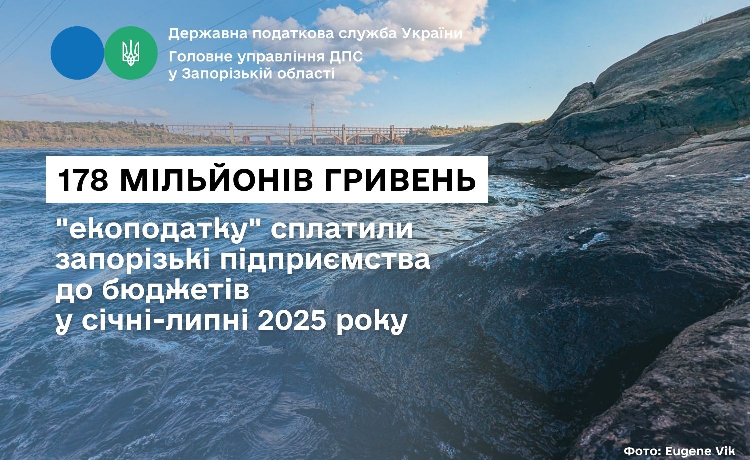 За підсумками перших семи місяців 2025 року компанії та організації Запорізької області перерахували до бюджетів усіх рівнів 178,4 мільйона гривень екологічного податку.