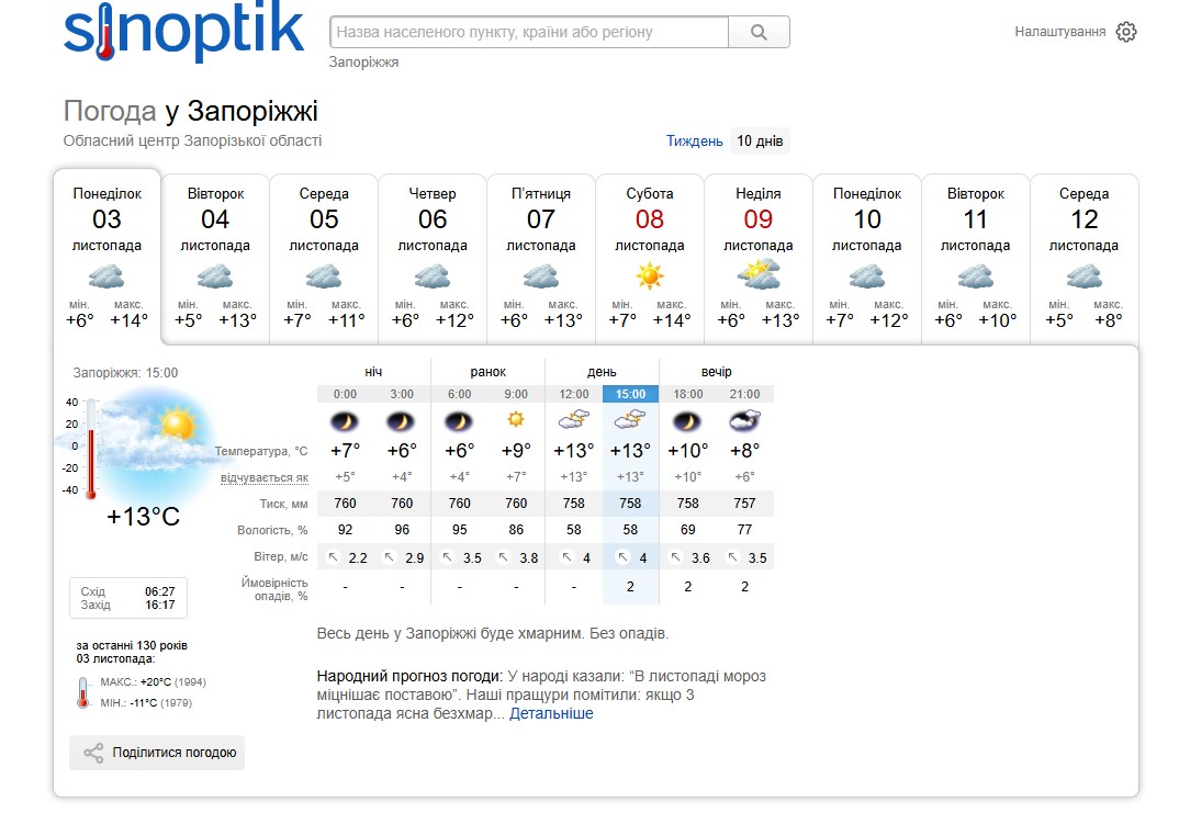 - Згідно з даними сайту Sinoptik, у місті у найближчі дні — денні температури переважно +10…+14 °C, нічні +4…+7 °C.