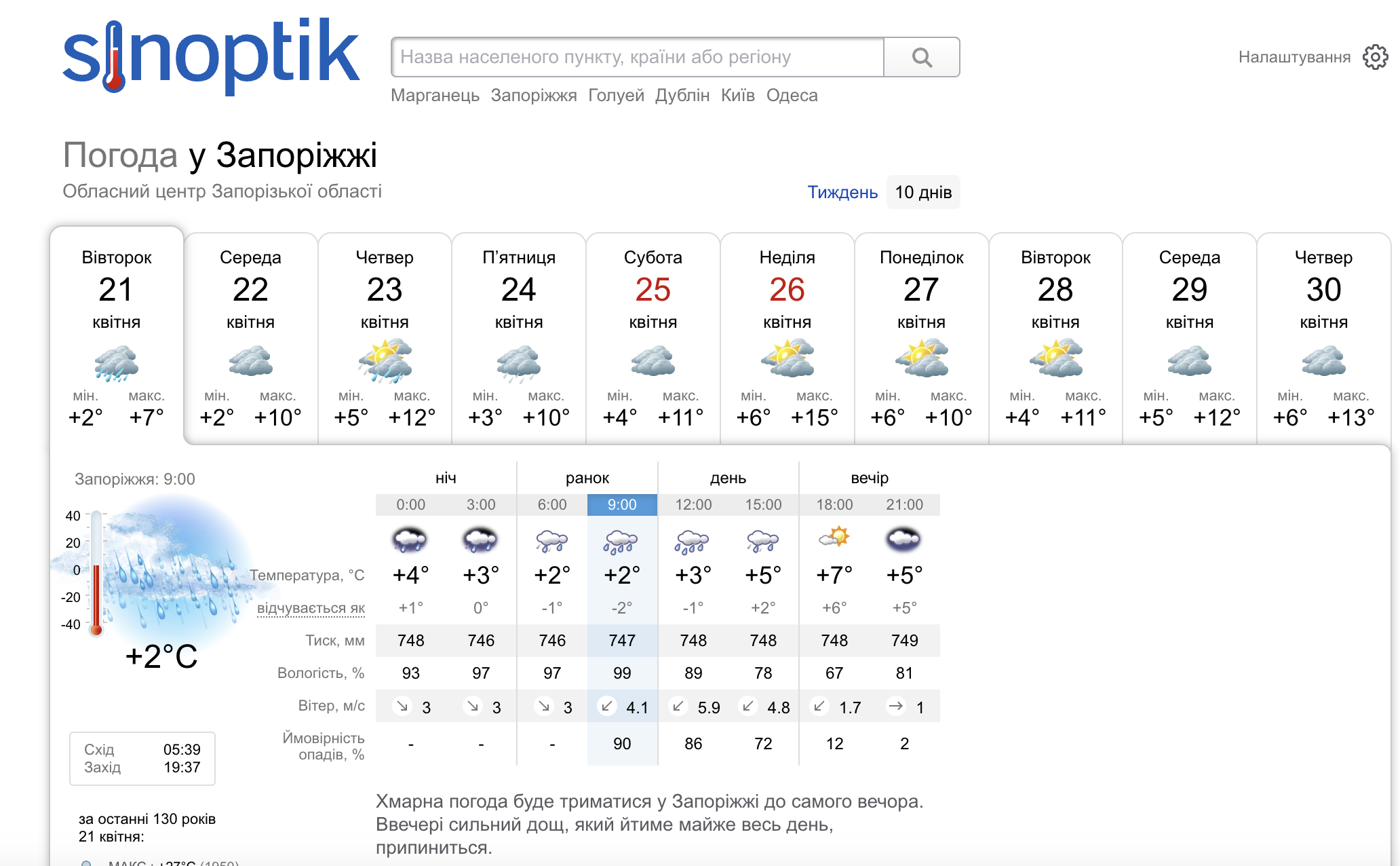 Судячи з прогнозу, більш стабільна погода у Запоріжжі почнеться вже у вихідні. У суботу, 25 квітня, опади припиняться, небо залишиться хмарним, а температура підніметься до +11 градусів. У неділю, 26 квітня, у місті очікується вже приємніше весняне потепління — до +15 градусів удень.