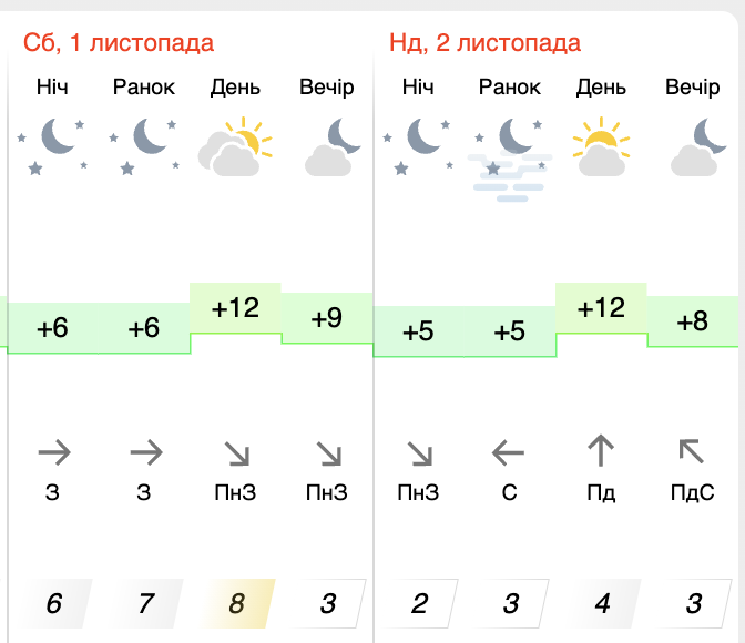 - Вітер — західний та північно-західний, швидкістю 6–8 м/с, без сильних поривів.
