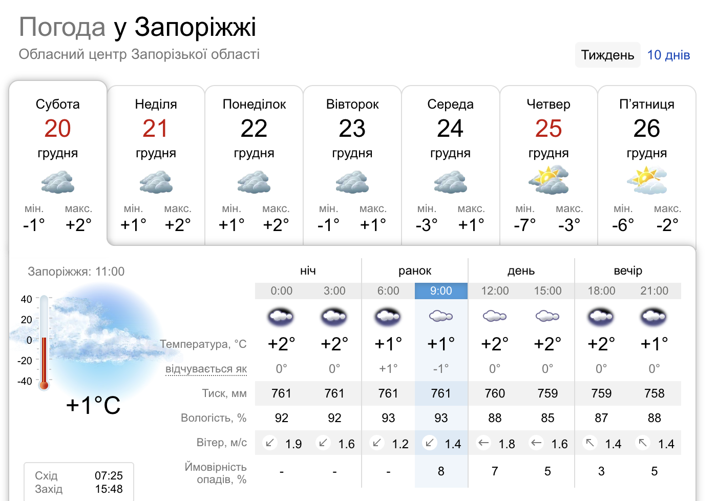 Таким чином, Різдво у Запоріжжі буде холодним, але сухим, без снігопадів і негоди. Погода сприятиме прогулянкам, однак містянам радять тепліше одягатися, особливо у вечірній час.
