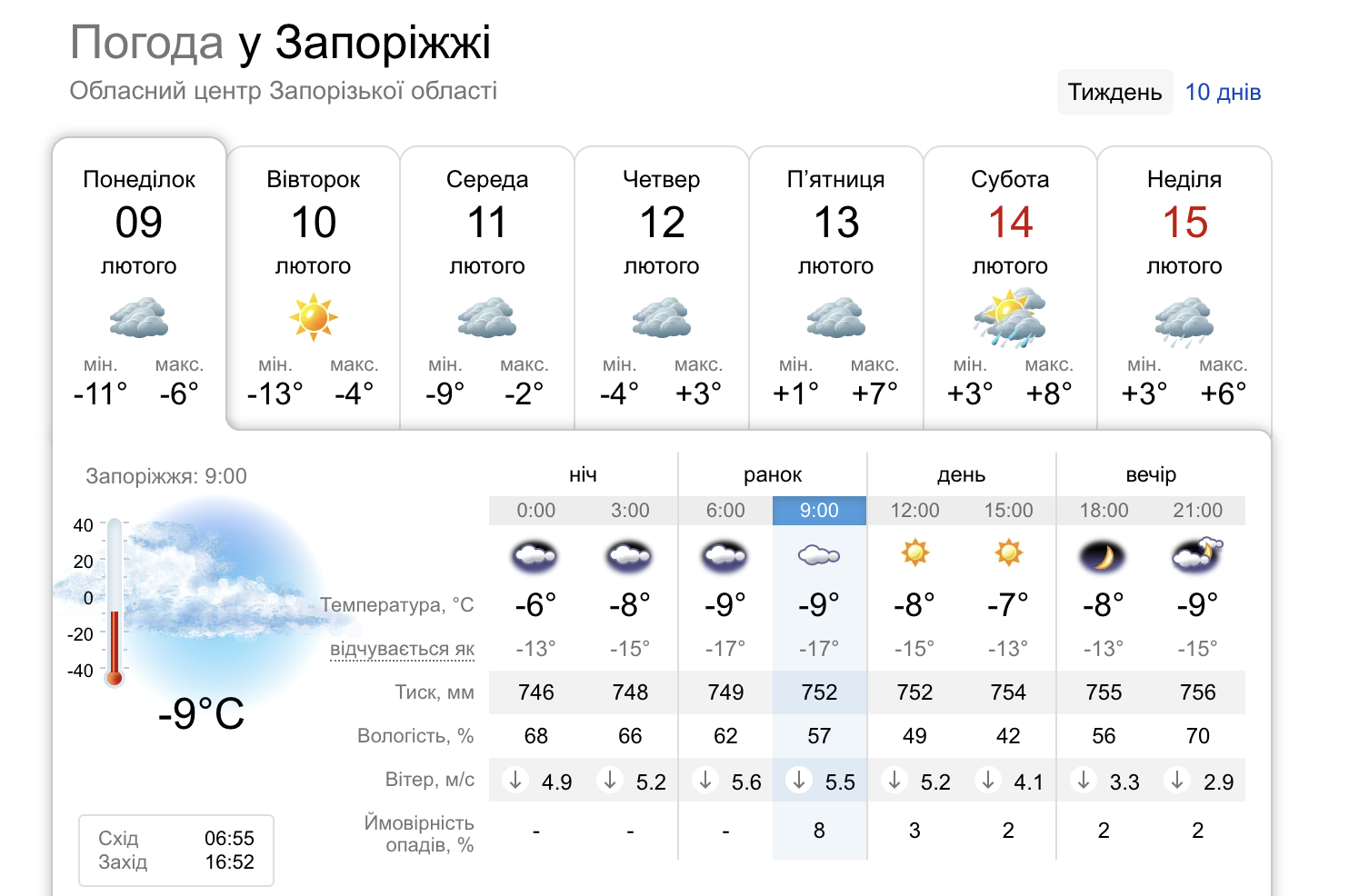 У Запоріжжі новий тиждень розпочався зі стійкого зимового холоду. Зранку 9 лютого в місті зафіксовано близько −9°C, при цьому відчутна температура ще нижча через помірний вітер. Небо переважно затягнуте хмарами, опади малоймовірні.