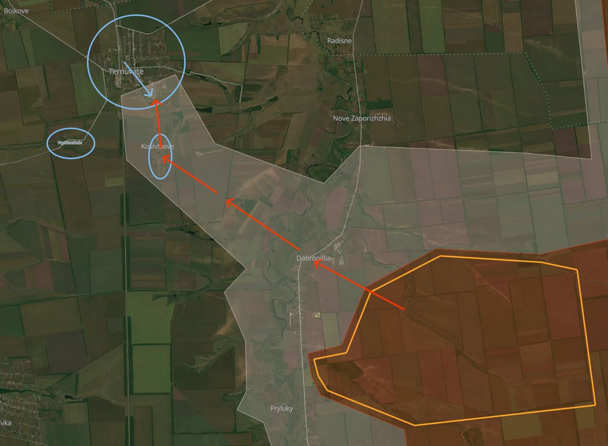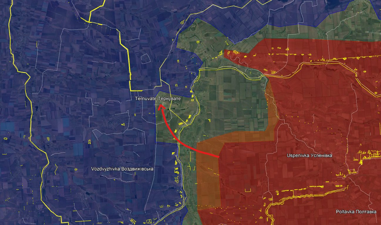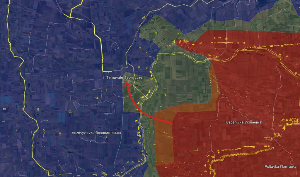 У цих трьох селах навіть розташовані деякі українські тилові служби, які я не буду уточнювати. Тернувате: Українські сили докладають зусиль для фізичного очищення південної частини Тернуватого від решти російських диверсантів, які наразі мають дуже обмежену свободу пересування. У поселенні знаходиться велика кількість українських піхотинців, і не очікується, що ситуація значно погіршиться.