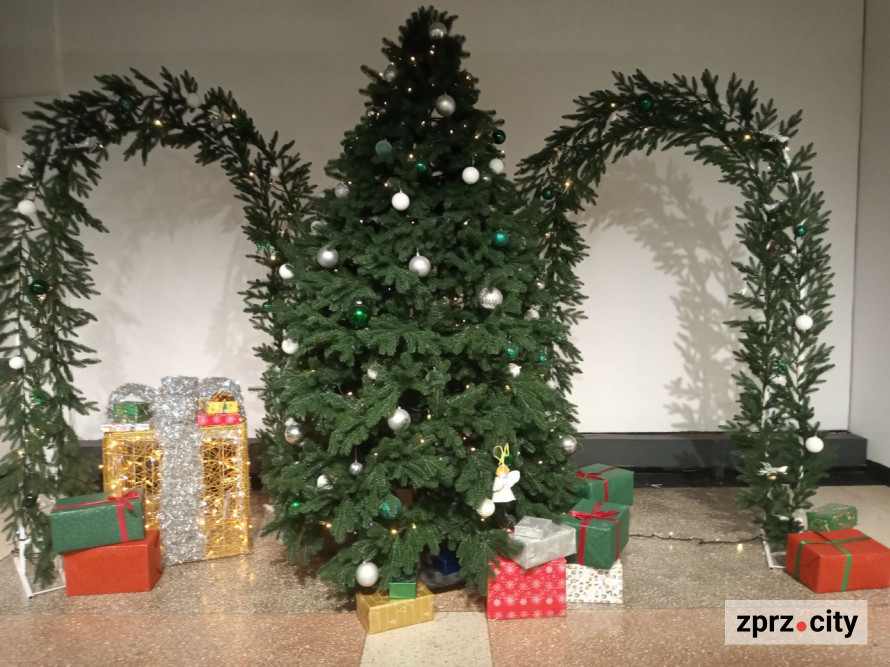 У ЦКП “Хортицький” облаштовані святкові фотозони і виставка дитячих робіт. Зовні центру — великі живі ялинки з гірляндами і світлові інсталяції.