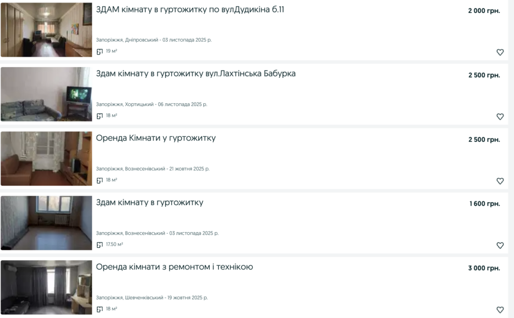 Ціни на оренду кімнат у гуртожитках Запоріжжя у листопаді 2025 року (ФОТО)