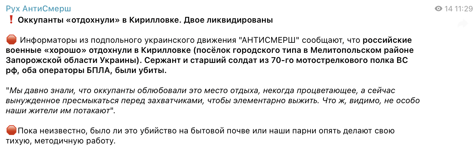 Інформацію поширив підпільний український рух “АНТИСМЕРШ”, який діє в тилу ворога. Активісти повідомили, що Кирилівка стала своєрідною зоною відпочинку для російських військових, і саме це зробило її об’єктом посиленого спостереження з боку спротиву.