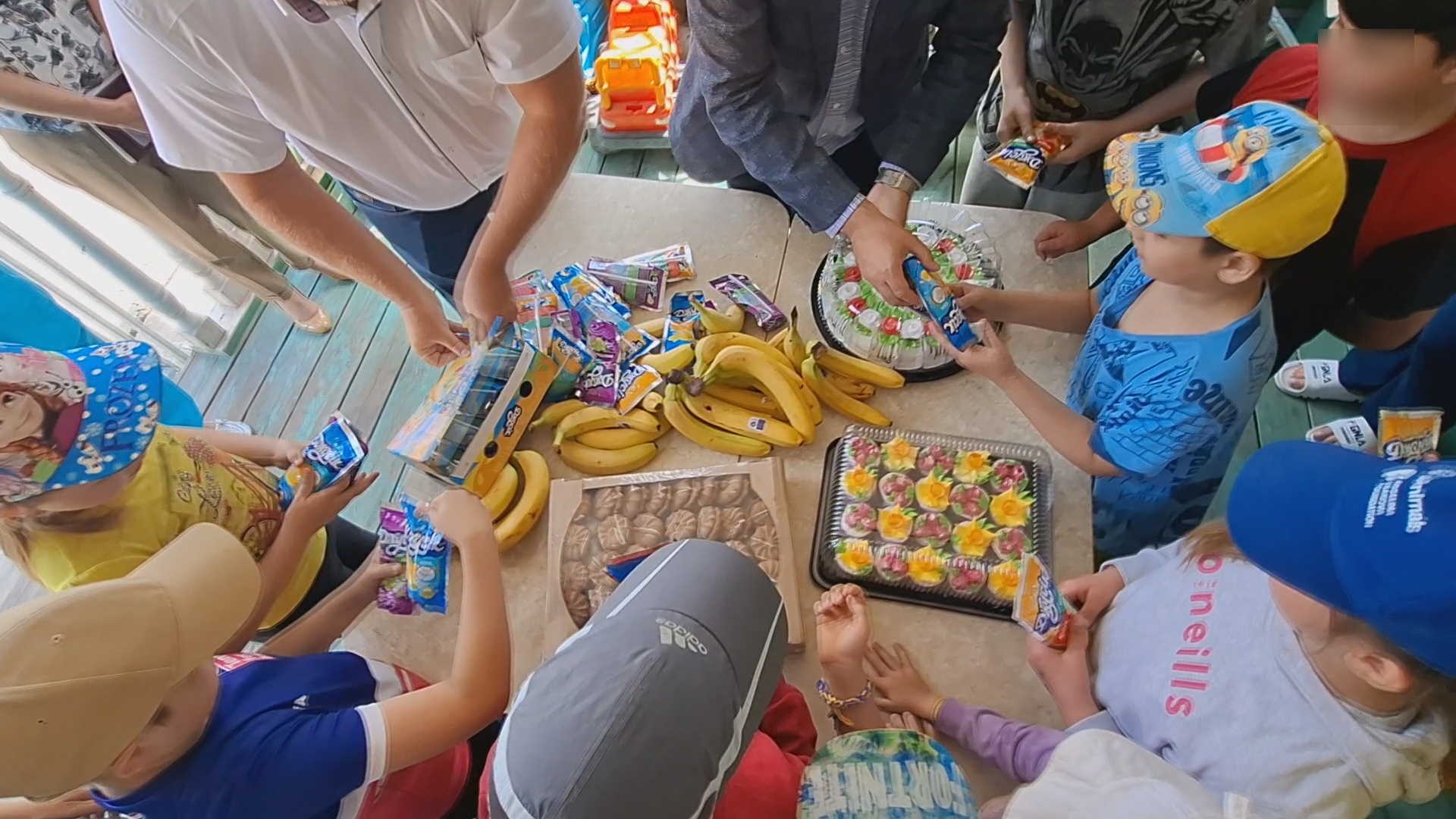 Крім того, він передав дітям солодощі та фрукти – печиво, тістечка, сік, а також торт.