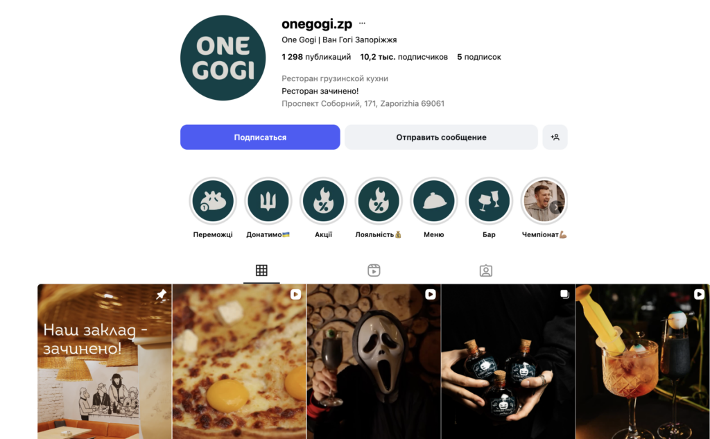 One Gogi розташовувався за адресою: проспект Соборний, 171. На сторінці закладу тепер зазначено коротко і просто: «Ресторан зачинено».