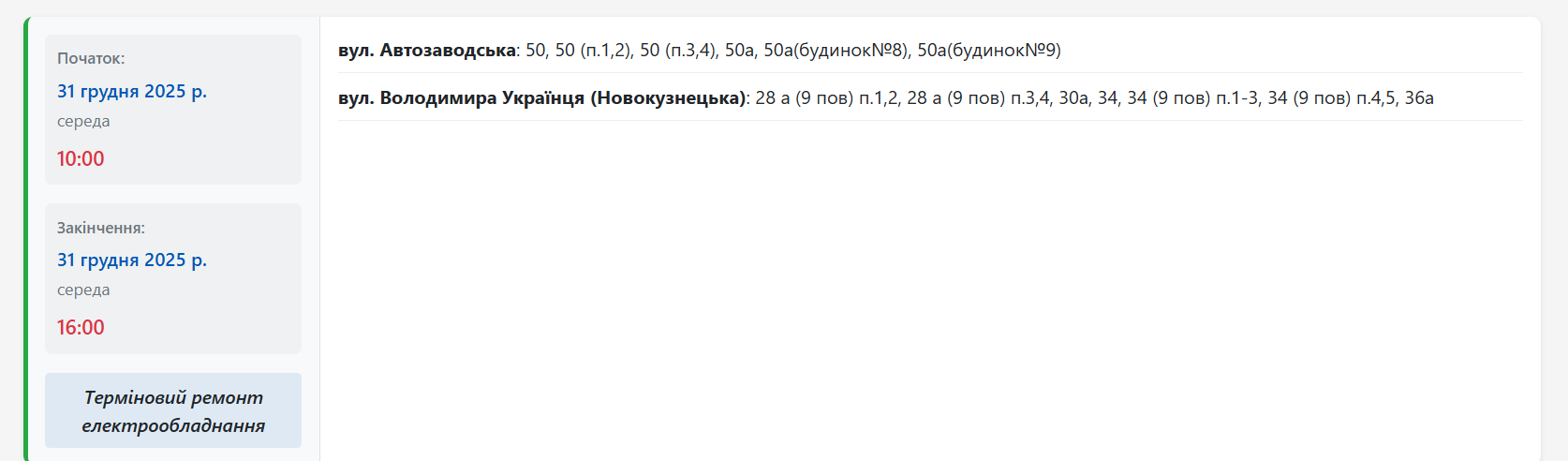 Тимчасова відсутність електроенергії спостерігатиметься за такими адресами: