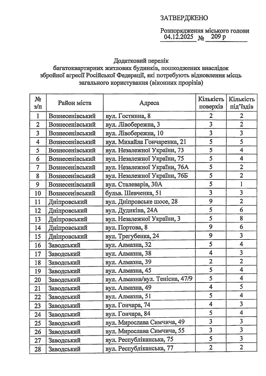 У списку опинилися 45 будинків майже з усіх районів міста. Найбільша кількість пошкоджених будинків – у Заводському, Шевченківському та Вознесенівському районах. Повний список будинків можна подивитися на фото з документу нижче.