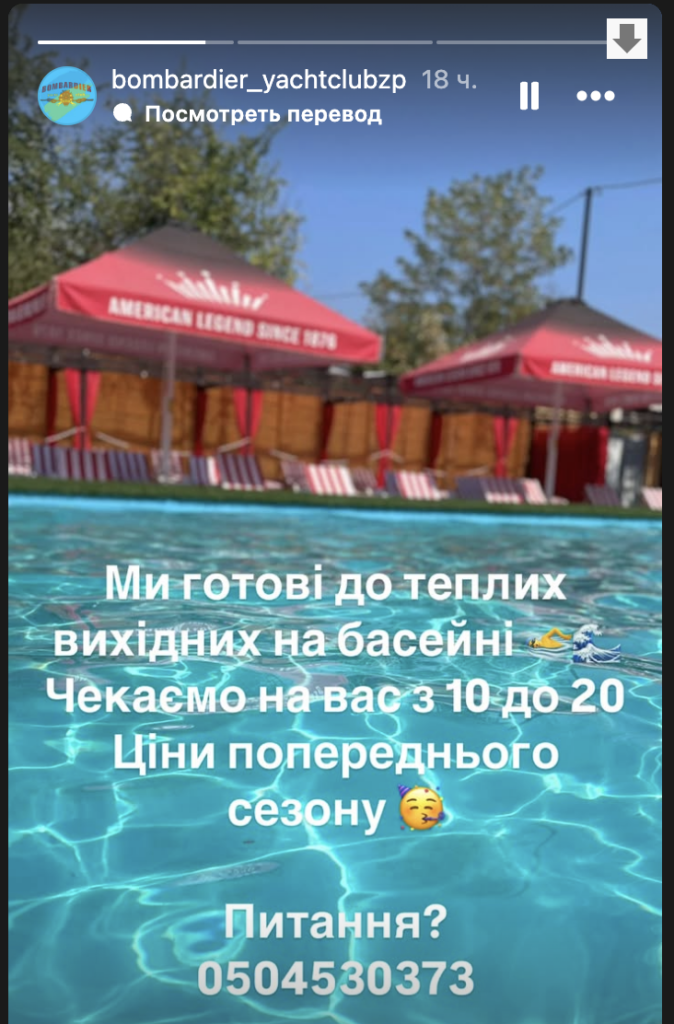 У Запоріжжі анонсували сезон літнього відпочинку біля води — комплекс Bombardier Yacht Club відкриває свої двері для відвідувачів. З 10:00 до 20:00 щодня запоріжці та гості міста можуть насолодитися відпочинком біля басейну, зберігаючи тарифи минулого сезону.