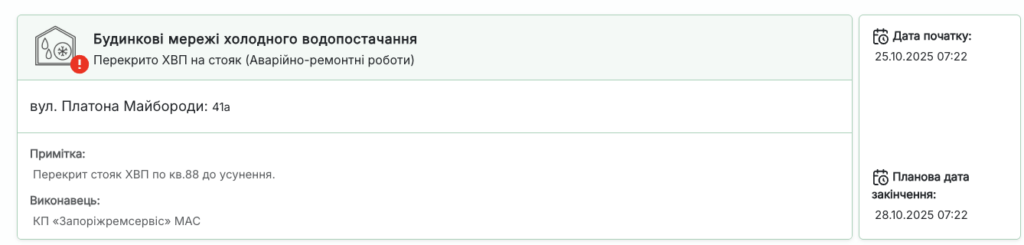 За інформацією комунальників, перекрито стояк ХВП до квартири №88. Водопостачання буде відновлено після завершення ремонтних робіт.