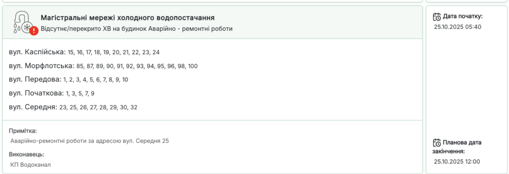 - Початок робіт: 25 жовтня 2025 року, 07:22