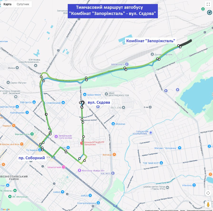 - «Комбінат “Запоріжсталь” — Південне шосе — вул. Діагональна — вул. В’ячеслава Зайцева — просп. Соборний — вул. Якова Новицького — вул. Сєдова».