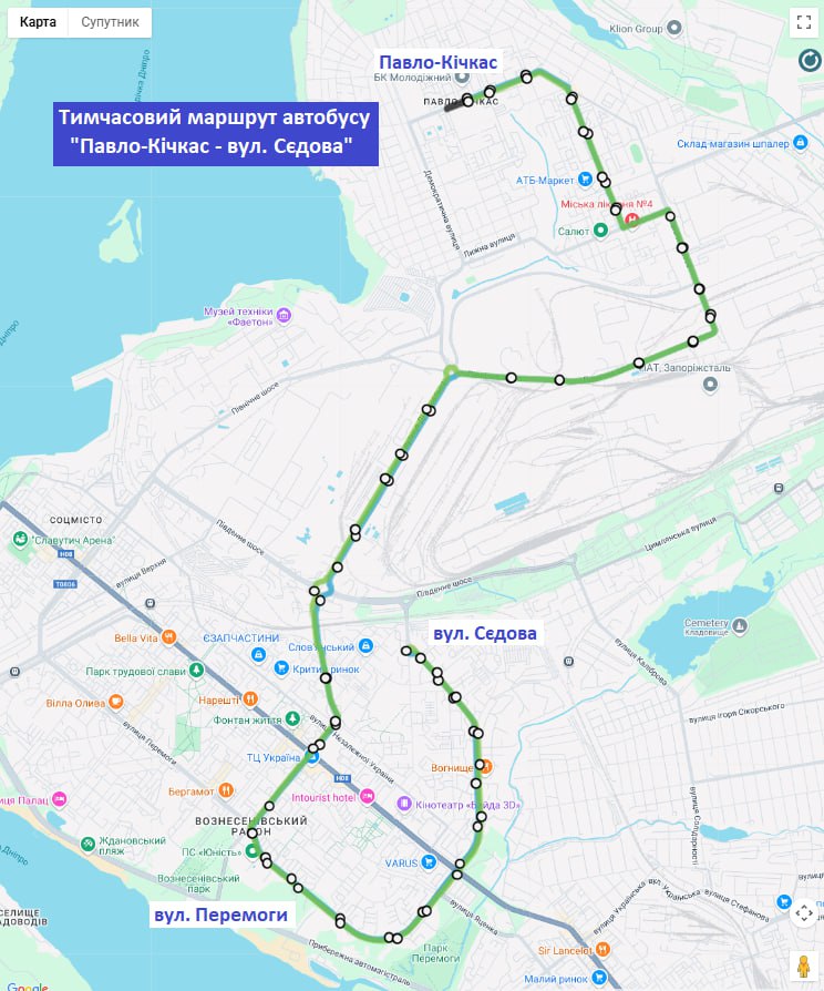 - «Павло Кічкас» — «вул. Діагональна» — «вул. Перемоги» — «вул. Сєдова».