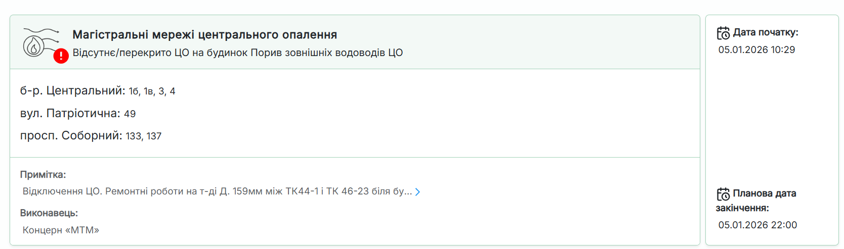 Аварійно-відновлювальні роботи розпочалися 5 січня о 10:29. Планується, що подачу центрального опалення буде відновлено до 22:00 цього ж дня.