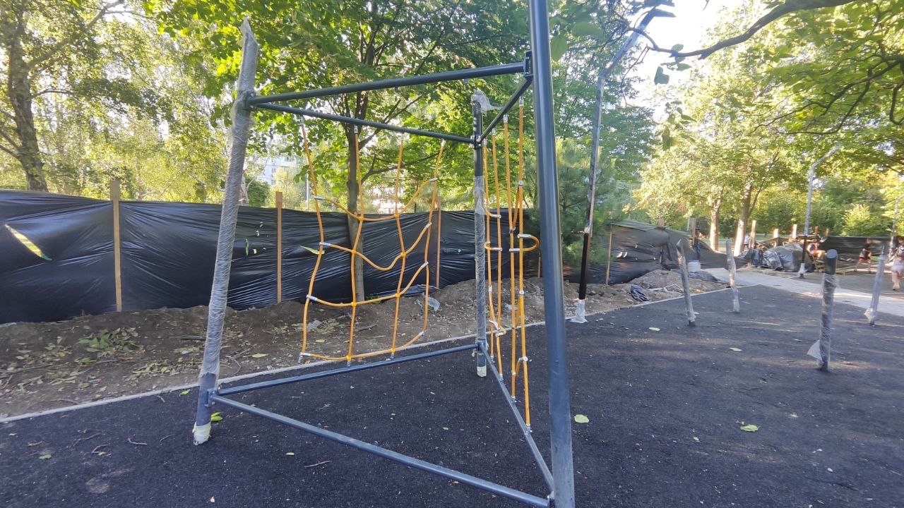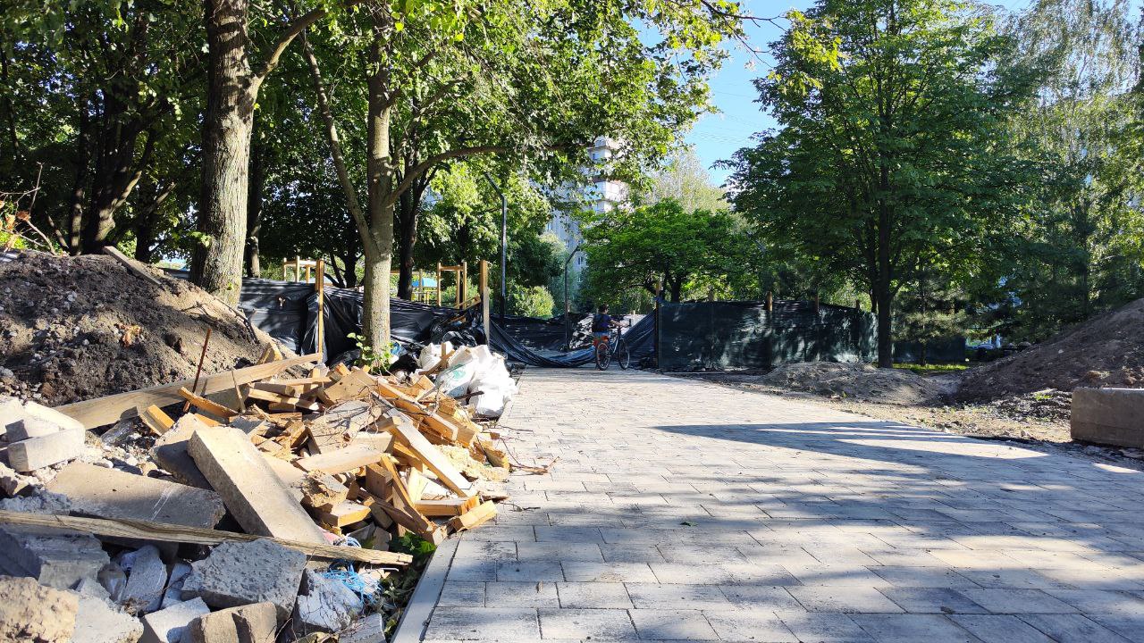 В середині – більшість ігрових комплексів ще не готові до експлуатації, деякі з них – відверто небезпечні, наприклал лавки або майданчик “Містечко”. Також поруч купа неприбраного будівельного сміття.