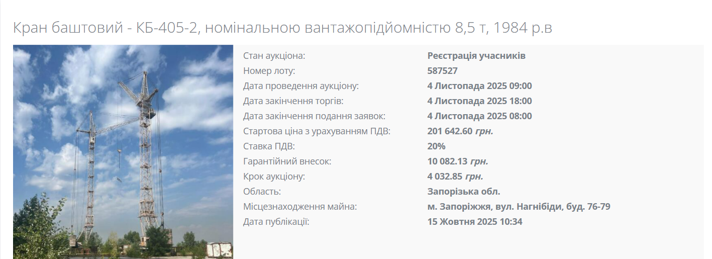 У Запоріжжі на державному електронному майданчику «СЕТАМ» оголошено аукціон із продажу баштового крана КБ-405-2, виготовленого у 1984 році.