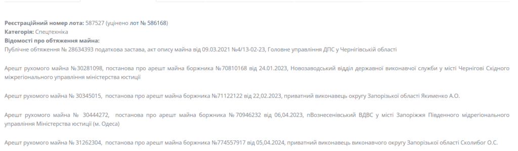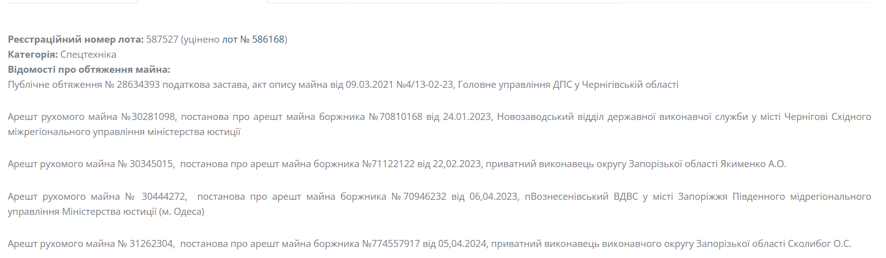 Згідно з даними аукціону, техніка перебуває під низкою арештів і податкових застав. Зокрема, податкова застава була накладена у 2021 році Головним управлінням ДПС у Чернігівській області. Крім того, у 2023–2024 роках на кран неодноразово накладали арешти органи державної виконавчої служби та приватні виконавці як у Запоріжжі, так і в Чернігові.