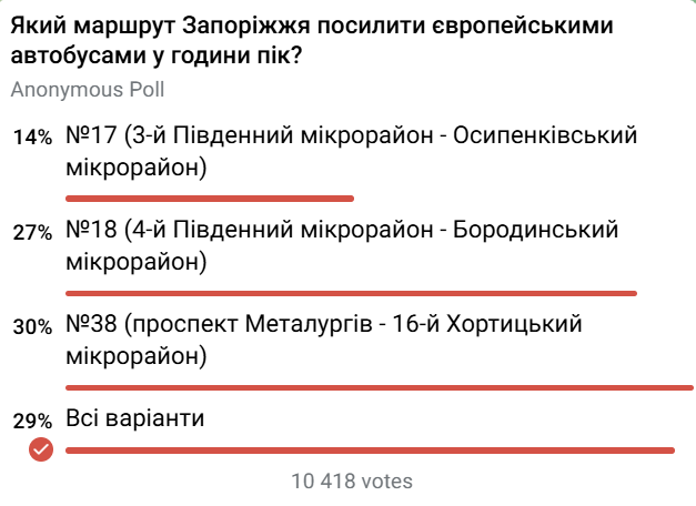 Так, минулого тижня у ЗОВА провели опитування, Мешканці Запоріжжя могли проголосувати за те, які наступні маршрути міста посилити європейськими автобусами у години пік – з 6:00 до 9:00 та з 19:00 до 23:00.