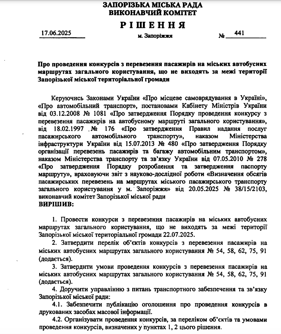 Міський виконком оголосив конкурс на маршрути № 54, 58, 62, 75 та 91. Прийом заявок триватиме до 7 липня 2025 року. Сам конкурс відбудеться 22 липня.