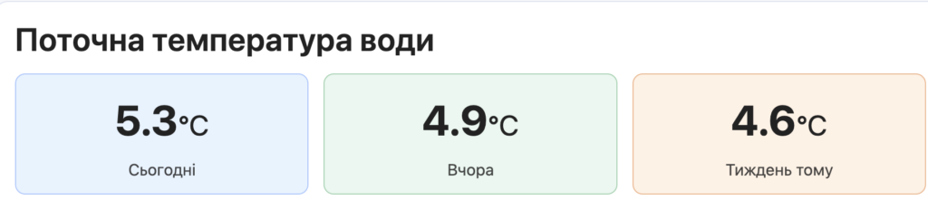 За актуальними даними, температура води сьогодні становить лише 5,3°C. Для порівняння, вчора показник був ще нижчим — 4,9°C. За таких умов купання є передчасним і може бути небезпечним для здоров’я навіть для фізично загартованих людей.
