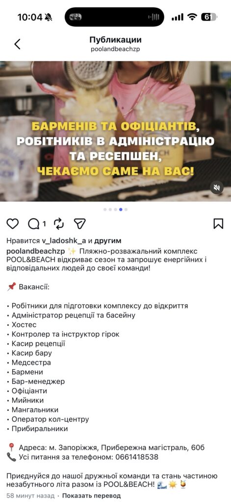 У Запоріжжі пляжно-розважальний комплекс POOL&BEACH оголосив набір працівників перед стартом нового сезону. Заклад запрошує до команди одразу на кілька напрямків — від підготовки території до роботи на рецепції, у барі та сервісній зоні.