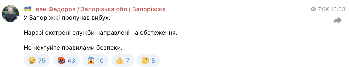 У Запоріжжі пролунав вибух, — ОВА